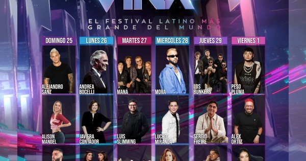 El domingo 25 se presentarán Alejandro Sanz y Manuel Turizo, el lunes 26 Andrea Bocelli y Miranda!, el martes 27 será el turno de Maná y Men At Work, el miércoles 28 el de Mora y Anitta, el jueves 29 se presentarán Los Bunkers y Young Cister, y el viernes 1 de marzo Peso Pluma y María Becerra coronarán la última noche.