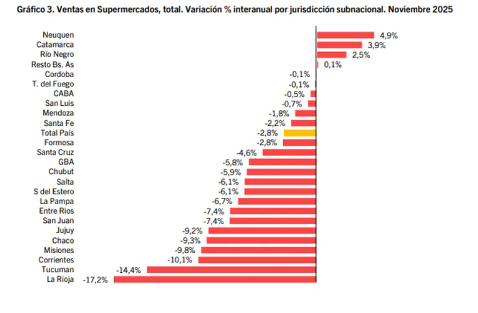 En este contexto de retracción generalizada, Neuquén lidera el ranking de provincias con crecimiento en las ventas. En noviembre, el consumo en supermercados de la provincia aumentó un 4,9% interanual, ubicándose al frente de un reducido grupo de jurisdicciones con números positivos. Detrás se ubicaron Catamarca (3,9%), Río Negro (2,5%) y Buenos Aires sin el conurbano (0,1%).