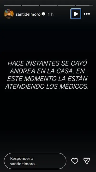 El conductor Santiago del Moro compartió en sus historias de Instagram una imagen en negro con el mensaje: “Hace instantes se cayó Andrea. En este momento la están atendiendo los médicos”.