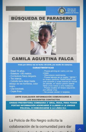 La Policía de Río Negro puso en marcha el protocolo de búsqueda de paradero para localizar a Camila Agustina Falca, una joven de 19 años que fue vista por última vez el lunes 16 de diciembre en General Roca, según registros obtenidos a través de cámaras de seguridad. La investigación se encuentra en curso y las autoridades solicitaron colaboración de la comunidad.