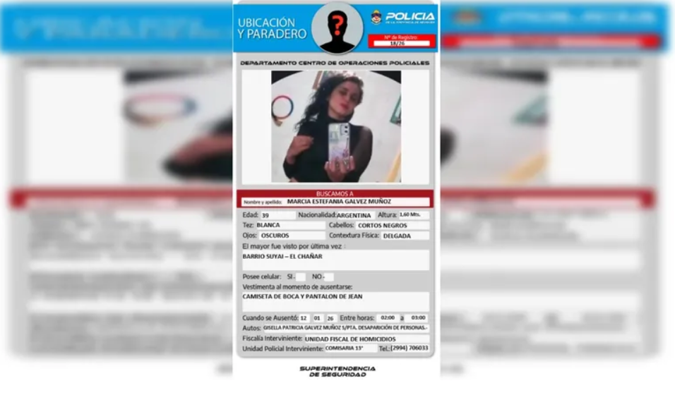El primer pedido de paradero corresponde a Marcia Estefanía Gálvez Muñoz, de 39 años, quien fue vista por última vez durante la madrugada del 12 de enero, entre las 2 y las 3, en el barrio Suyai de El Chañar.
