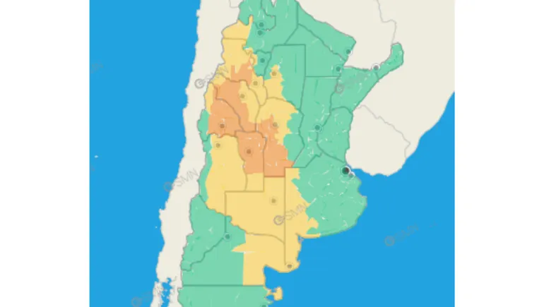 Las provincias bajo alerta naranja son San Luis, Córdoba, San Juan, La Rioja y Catamarca, donde se prevén vientos del sur con ráfagas que podrían superar los 100 km/h, además de viento zonda, altas temperaturas y baja visibilidad. Las alertas amarillas se extienden a Chubut, Río Negro, La Pampa, Buenos Aires, Mendoza, Salta y Santiago del Estero, con pronóstico de lluvias intensas, fuertes ráfagas e intensa actividad eléctrica.