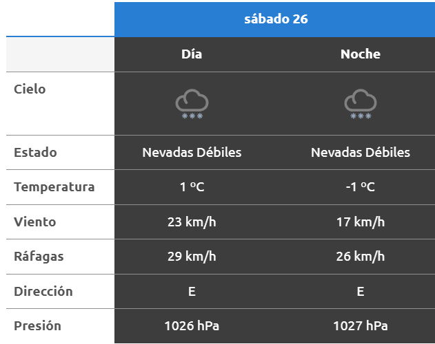 El parte del servicio meteorológico prevé que para después del mediodía el cielo estará nevadas fuertes y los vientos del sector noreste tendrán velocidades estimadas entre 13 y 22 km/h. La temperatura pronosticada sería de 2 grados.