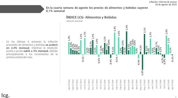 De acuerdo con la consultora LCG, que releva más de 8.000 productos en cinco supermercados, la medición “punta a punta” estuvo marcada por los aumentos de la primera quincena. En promedio mensual, los alimentos avanzaron 2,4%.