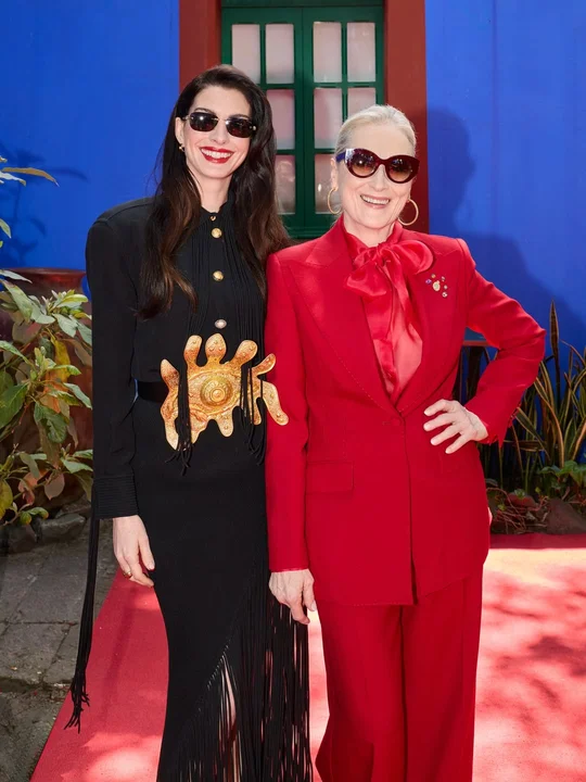 Durante la jornada, ambas figuras lucieron vestuarios destacados: Streep optó por un conjunto monocromático rojo con un accesorio floral en referencia a la artista mexicana, mientras que Hathaway vistió un conjunto negro con detalles dorados.