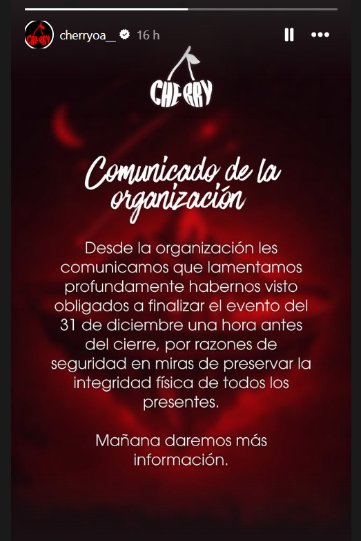 Desde la organización de la fiesta se aguarda un comunicado oficial en las próximas horas. El evento debió finalizar una hora antes de lo previsto por razones de seguridad.
