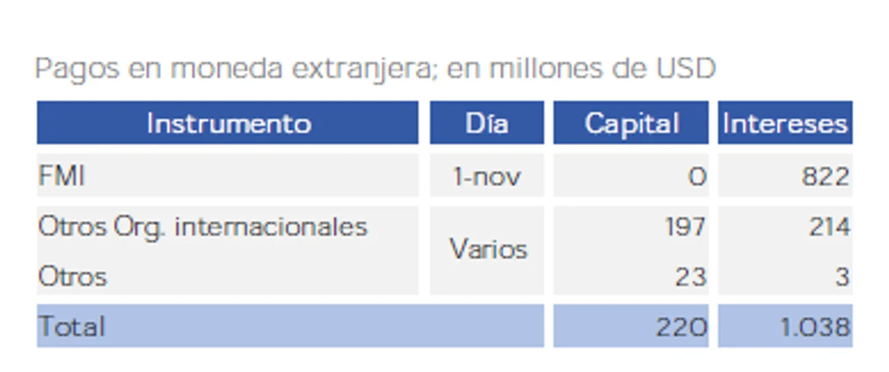 A diferencia de los vencimientos de capital, los intereses no pueden postergarse. En total, los compromisos en moneda extranjera para noviembre ascienden a US$ 1.038 millones, sumando otros US$ 217 millones con distintos organismos multilaterales.
