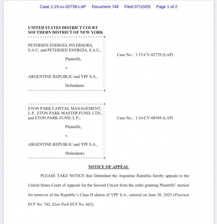 El Gobierno argentino formalizó la apelación contra el fallo dictado por la jueza Loretta Preska en Nueva York, que obliga al país a entregar acciones de YPF como parte del cumplimiento de la sentencia por US$ 16.000 millones, derivada de la nacionalización de la petrolera en 2012.