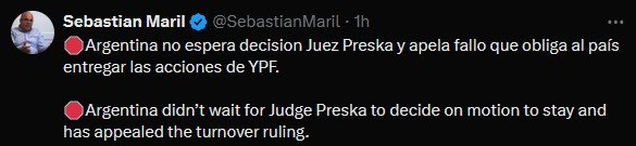 La novedad fue difundida por el analista Sebastián Maril a través de sus redes sociales, donde sigue de cerca el litigio internacional.