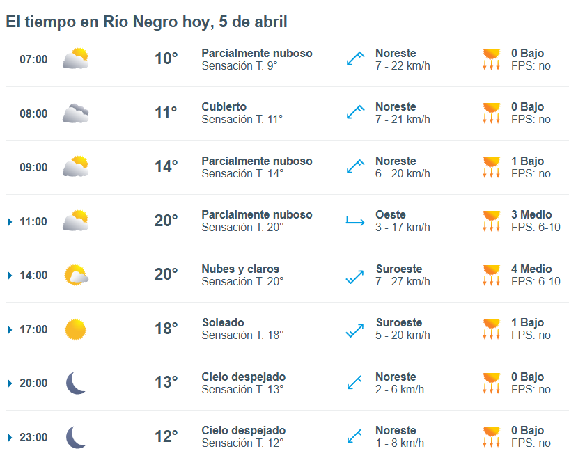 El pronóstico del tiempo para la ciudad de Río Negro, indica que hoy 5 de abril el cielo estará parcialmente nublado por la mañana y la temperatura rondará entre 9 grados.