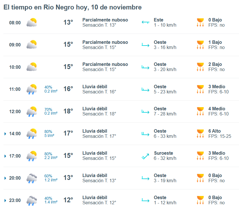 El pronóstico del tiempo para la ciudad de Río Negro, indica que hoy 10 de noviembre el cielo estará algo nublado por la mañana y la temperatura rondará entre 13 grados.
