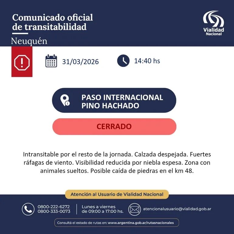 Las condiciones meteorológicas en el centro del territorio neuquino afectan la transitabilidad en las rutas y pasos internacionales a Chile. Desde Vialidad Nacional informaron en la tarde de este martes que los fuertes vientos sobre la Ruta 242 impiden que permanezca habilitado el Paso Internacional Pino Hachado.