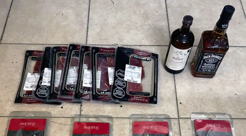 Los empleados llamaron a la Policía, y al revisar al sujeto encontraron: siete sobres de jamón crudo premium, una botella de gin artesanal Bosque, una de whisky Jack Daniel’s y cuatro cuchillos con chailas en paquete cerrado. Una selección más acorde a un asado deluxe que a la cena cotidiana.
