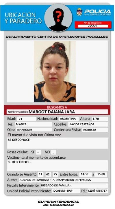 La Policía de la Provincia de Neuquén emitió un pedido de paradero para dar con Margot Daiana Jara, una joven de 21 años que permanece desaparecida desde el viernes 11 de julio. La denuncia fue radicada en el Juzgado de Familia y la investigación está a cargo de la División de Búsqueda de Personas.
