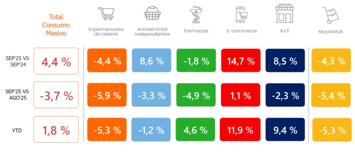 El consumo masivo registró en septiembre una caída significativa, con una baja de 6,3% respecto al mismo mes del año pasado y un retroceso de 7,9% frente a agosto de 2025, según el informe de la consultora Focus Market con datos de Scanntech. En lo que va del año, el consumo acumulado muestra una disminución del 3%.