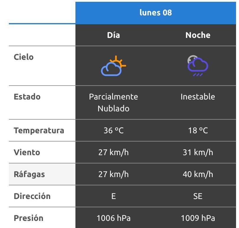 El parte del servicio meteorológico prevé que para después del mediodía el cielo estará mayormente nublado y los vientos del sector norte tendrán velocidades estimadas entre 13 y 22 km/h. La temperatura pronosticada sería de 35 grados.