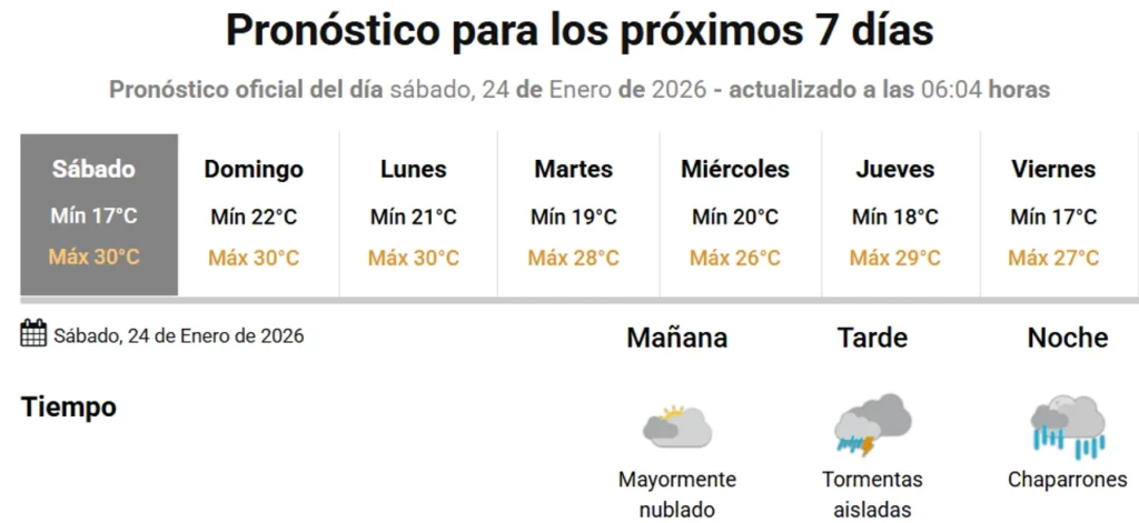 El sábado y el domingo se presentan con marcas máximas que superarán los 30 grados. Para este sábado se prevé una mínima de 17°C y una máxima superior a los 30°C, mientras que el domingo el calor será aún más intenso, con mínimas por encima de los 20°C. En paralelo, el pronóstico anticipa lluvias y tormentas, algunas de ellas de fuerte intensidad.