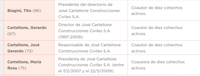 - José Gerardo Cartellone (73): Responsable de la compañía, coautor de diez cohechos.
