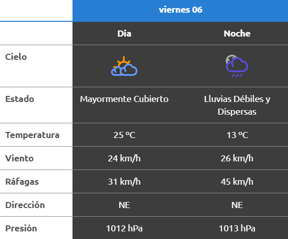 De acuerdo al parte del Servicio Meteorológico Nacional, el clima presenta una probabilidad de lluvia de entre 10 y 40 por ciento, y los vientos del norte correrán a una velocidad de entre 23 y 31 kilómetros por hora. La humedad sería del 64 por ciento, y la visibilidad sería regular.
