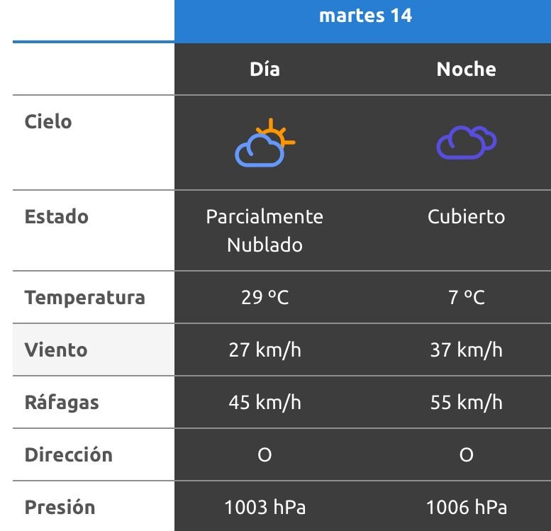 El parte del servicio meteorológico prevé que para después del mediodía el cielo estará parcialmente nublado y los vientos del sector oeste tendrán velocidades estimadas entre 32 y 41 km/h. La temperatura pronosticada sería de 26 grados.