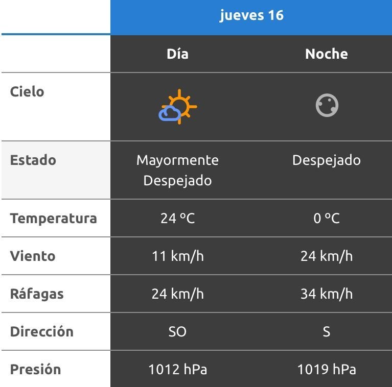 A la noche, el clima rondará los 15 grados, mientras que los vientos serán del oeste y soplarán a una velocidad de 24 kilómetros por hora. La probabilidad de lluvia estaría en el orden del por ciento para esta franja del día.