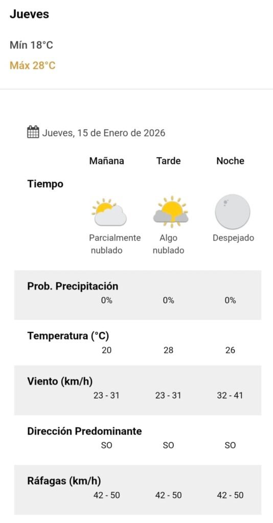 El parte del servicio meteorológico prevé que para después del mediodía el cielo estará parcialmente nublado y los vientos del sector sudoeste tendrán velocidades estimadas de entre 23 y 31 km/h. La temperatura pronosticada sería de 26 grados.