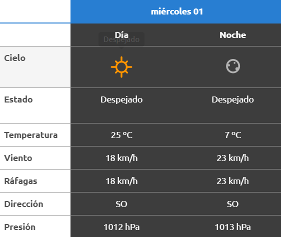 De acuerdo al parte del Servicio Meteorológico Nacional, el clima se presentaría sin lluvias, y los vientos del sudoeste correrán a una velocidad de entre 13 y 22 kilómetros por hora. La humedad sería del 63 por ciento, y la visibilidad sería buena.