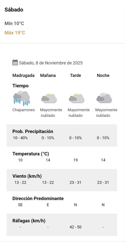 El parte del servicio meteorológico prevé que para después del mediodía el cielo estará mayormente nublado y los vientos del sector norte tendrán velocidades estimadas de entre 23 y 31 km/h. La temperatura pronosticada sería de 19 grados.