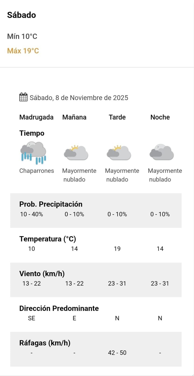 Durante la tarde el cielo estará con tormentas aisladas y los vientos del sector noreste tendrán velocidades estimadas de entre 23 y 31 km/h. La temperatura pronosticada sería de 15 grados. A la noche, el clima rondará los 8 grados, mientras que los vientos serán del este y correrán a una velocidad de entre 13 y 22 kilómetros por hora. La probabilidad de lluvia estaría en el orden del entre 40 y 70 por ciento para esta franja del día.