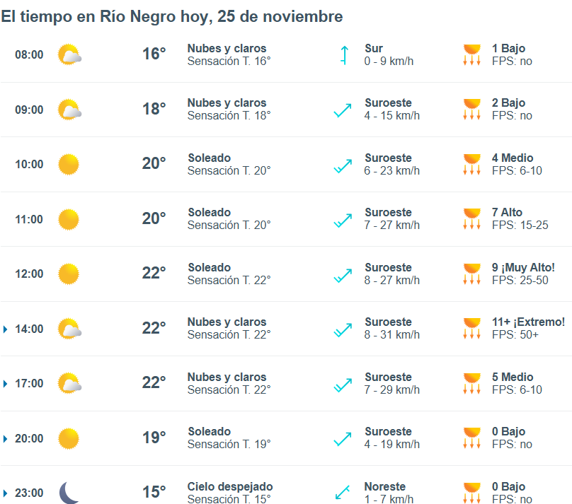De acuerdo al parte del Servicio Meteorológico Nacional, el clima en esta ciudad de Río Negro se presentaría sin lluvias, y los vientos del este correrán a una velocidad de entre 23 y 31 kilómetros por hora. La humedad sería del 67 por ciento, y la visibilidad sería buena.