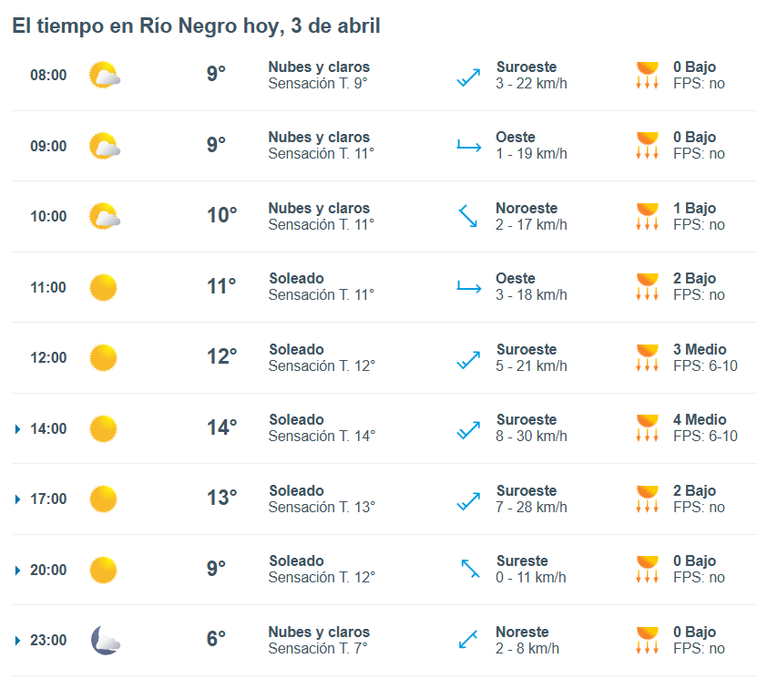El pronóstico del tiempo para la ciudad de Río Negro, indica que hoy 3 de abril el cielo estará con lluvias aisladas por la mañana y la temperatura rondará entre 10 grados.