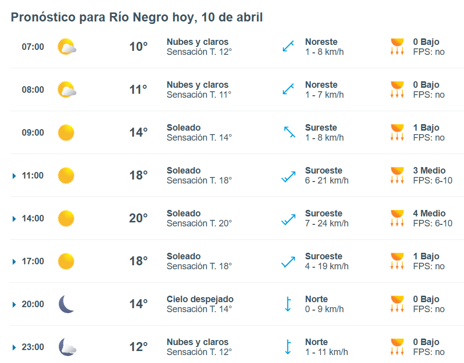 El pronóstico del tiempo para la ciudad de Río Negro, indica que hoy 10 de abril el cielo estará algo nublado por la mañana y la temperatura rondará entre 8 grados.