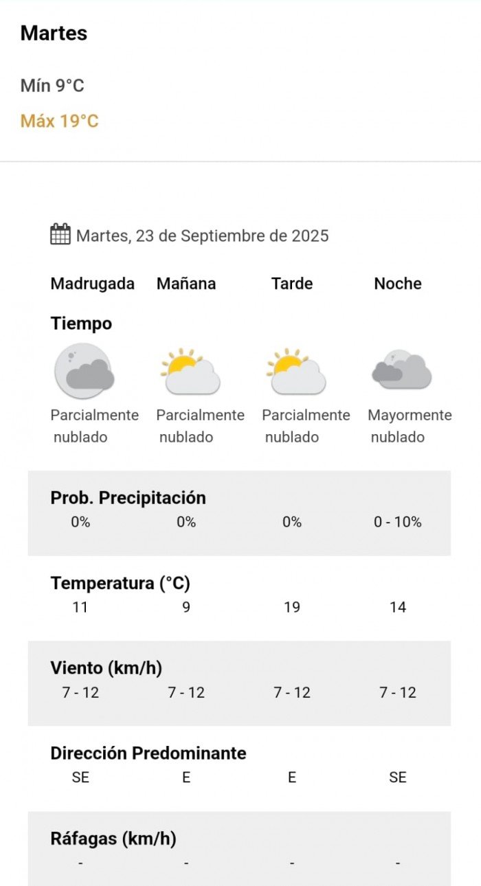 El parte del servicio meteorológico prevé que para después del mediodía el cielo estará parcialmente nublado y los vientos del sector este tendrán velocidades estimadas entre 7 y 12 km/h. La temperatura pronosticada sería de 19 grados.