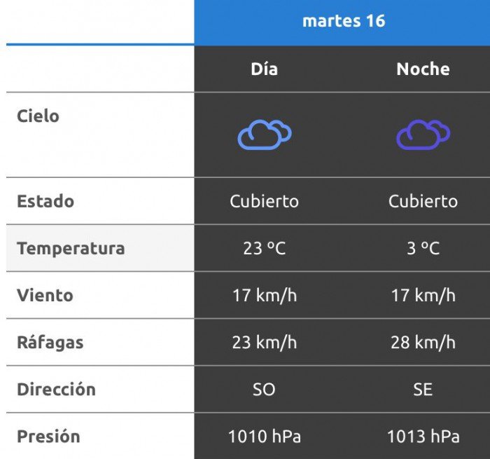 El parte del servicio meteorológico prevé que para después del mediodía el cielo estará parcialmente nublado y los vientos del sector noroeste tendrán velocidades estimadas de entre 13 y 22 km/h. La temperatura pronosticada sería de 25 grados.