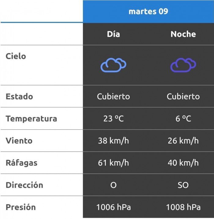 Después del mediodía se espera cielo ventoso y los vientos del sector sudoeste tendrán velocidades estimadas de entre 51 y 59 km/h. La temperatura pronosticada sería de 21 grados. A la noche, el clima rondará los 14 grados, mientras que los vientos serán del sudoeste y correrán a una velocidad de entre 32 y 41 kilómetros por hora. La probabilidad de lluvia estaría en el orden del por ciento para esta franja del día.
