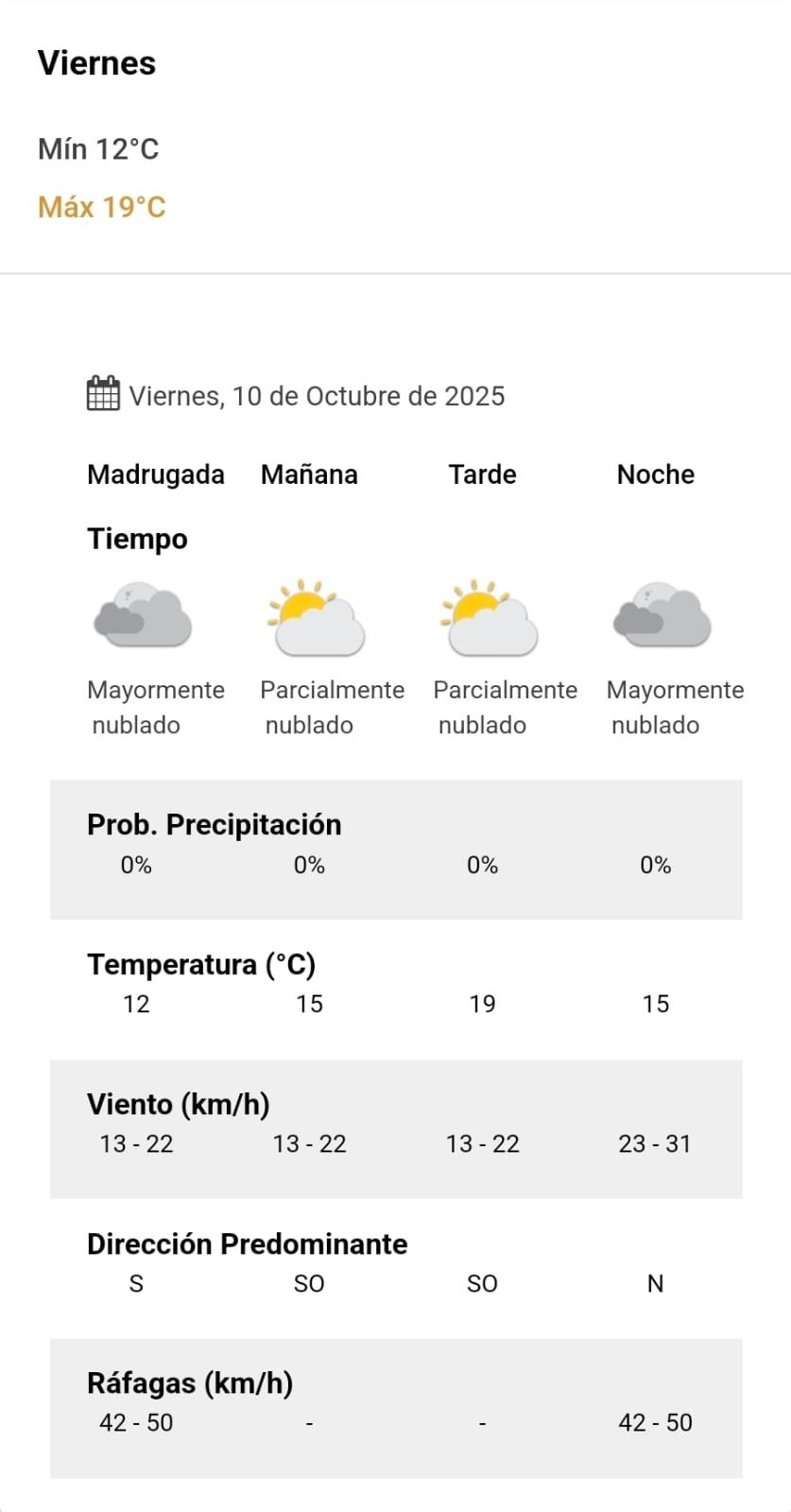 El parte del servicio meteorológico prevé que para después del mediodía el cielo estará parcialmente nublado y los vientos del sector sudoeste tendrán velocidades estimadas de entre 13 y 22 km/h. La temperatura pronosticada sería de 19 grados.