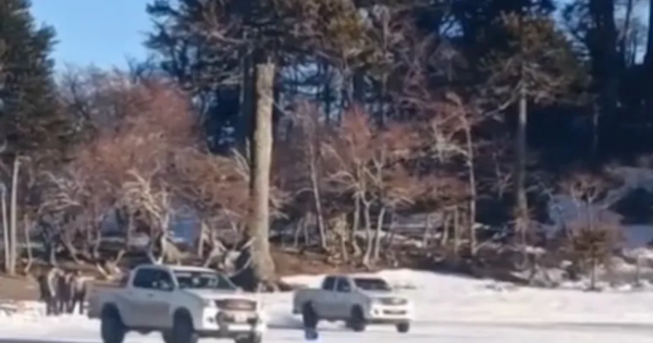 Este fin de semana, dos camionetas 4×4 ingresaron de forma ilegal a la laguna completamente congelada para realizar maniobras peligrosas conocidas como “coleadas” o “trompos”.