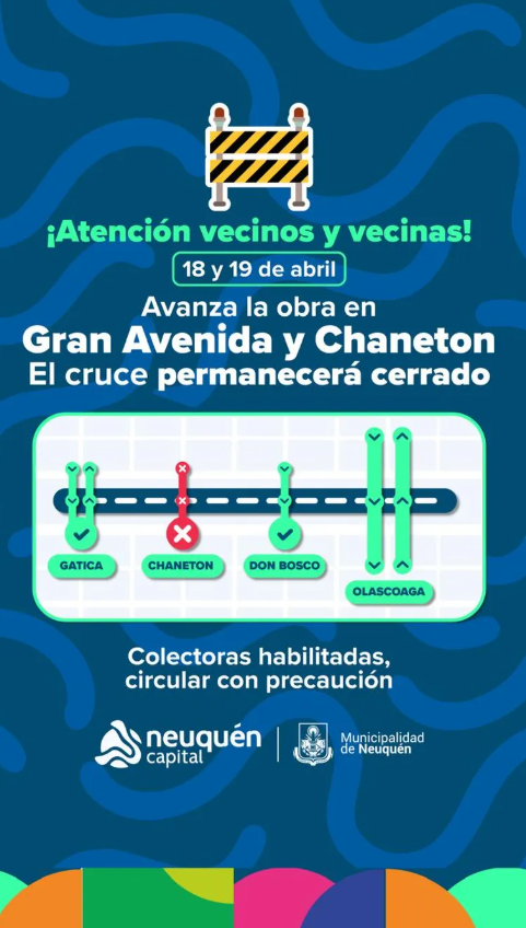 La Municipalidad de Neuquén anunció un corte total de tránsito en un punto clave de la obra sobre la Avenida Mosconi. La interrupción afectará el cruce con Chaneton durante este fin de semana, sábado 18 y domingo 19 de abril, por tareas vinculadas al avance del proyecto vial. El tránsito se restablecerá el lunes.