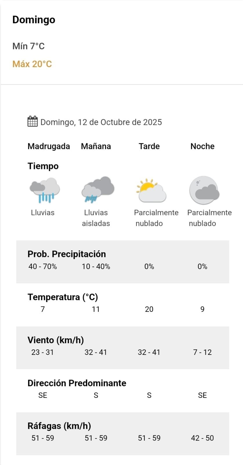 El parte del servicio meteorológico prevé que para después del mediodía el cielo estará parcialmente nublado y los vientos del sector sur tendrán velocidades estimadas de entre 32 y 41 km/h. La temperatura pronosticada sería de 20 grados.