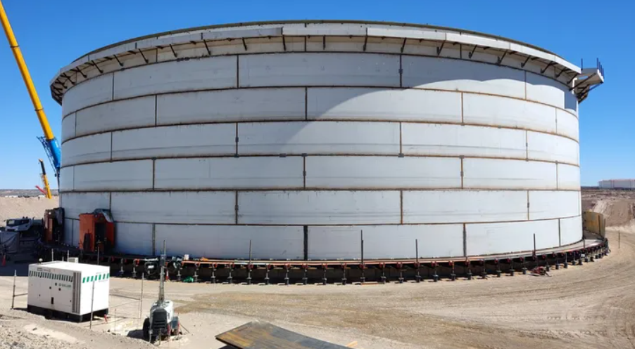 En la futura terminal de exportación ubicada sobre la costa rionegrina ya se construyeron las bases de los seis tanques previstos, con protección catódica instalada en casi la totalidad de ellos. Actualmente, hay tres tanques en proceso de montaje (TK404, TK401 y TK406), además de las bases del sistema contra incendios y de las trampas de scraper que integrarán el circuito operativo.