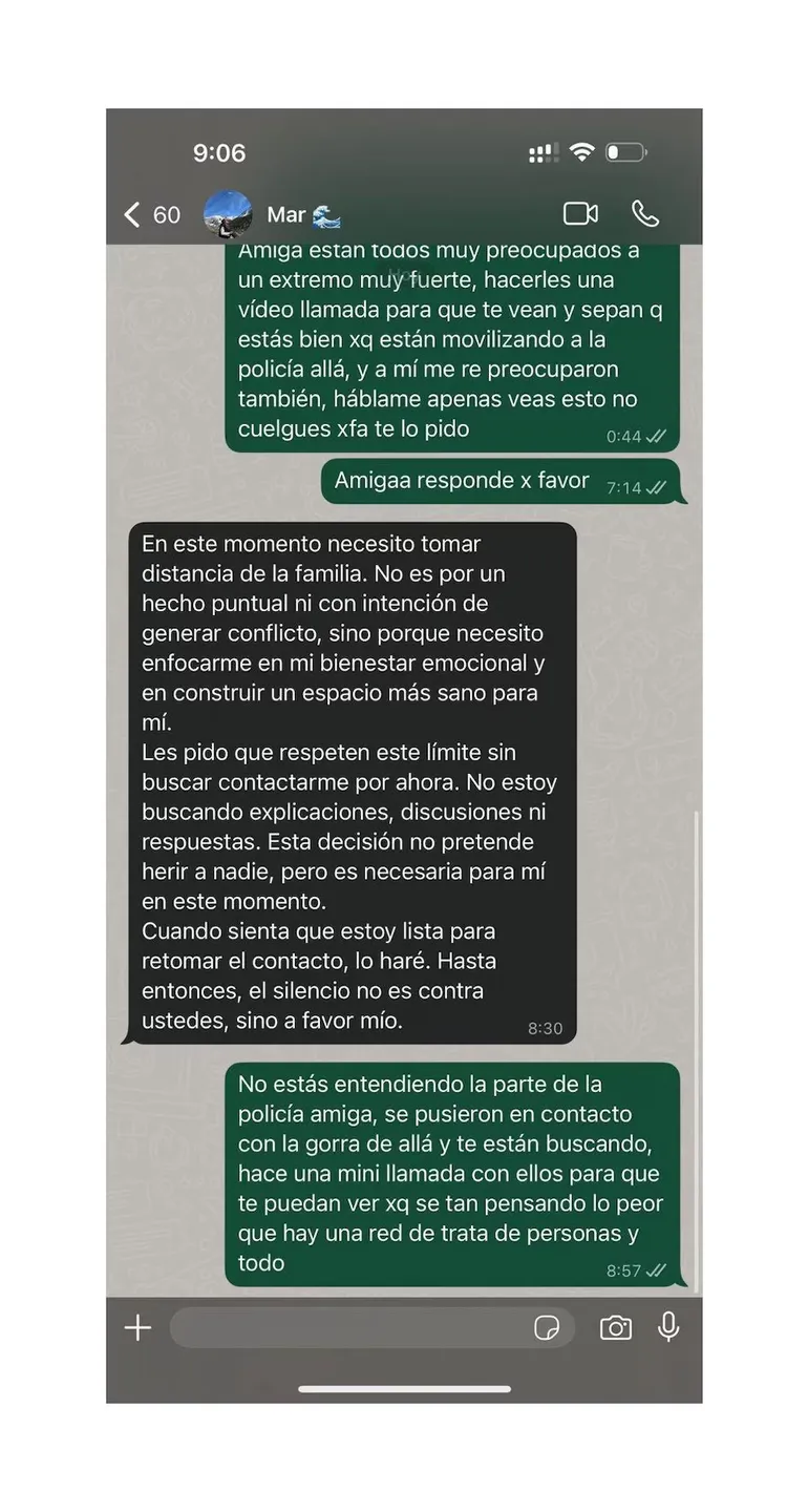 El intercambio comenzó con un amigo que le pedía comunicarse con urgencia: “Amiga, están todos muy preocupados… Háblame apenas veas esto, no cortes, por favor”. La respuesta llegó horas después desde el número de Mariana, pero su tono formal y distante hizo que la familia sospechara que no fue escrito por ella. El mensaje decía: “Necesito tomar distancia de la familia… enfocar mi bienestar emocional y construir un espacio más sano para mí. Les pido que respeten este límite…”.