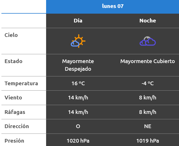 El parte del servicio meteorológico prevé que para después del mediodía el cielo estará ligeramente nublado y los vientos del sector noroeste tendrán velocidades estimadas entre 23 y 31 km/h. La temperatura pronosticada sería de 13 grados.