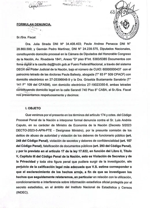 Un grupo de legisladores de Unión por la Patria presentó este viernes una denuncia penal contra el titular del Palacio de Hacienda por presuntas irregularidades en el manejo del Índice de Precios al Consumidor (IPC) elaborado por el Instituto Nacional de Estadística y Censos.