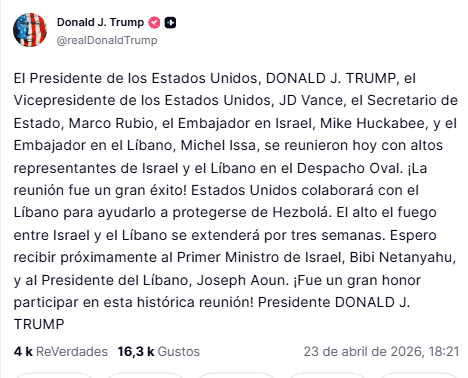 “El alto el fuego entre Israel y el Líbano se extenderá por tres semanas”, escribió Trump en su red Truth Social, donde también anticipó la posibilidad de avanzar hacia una negociación más amplia entre ambos países. “¡La reunión salió muy bien! Estados Unidos va a trabajar con el Líbano para ayudarlo a protegerse de Hezbollah”, agregó tras un encuentro en la Casa Blanca con altos funcionarios de su administración y representantes diplomáticos de la región.