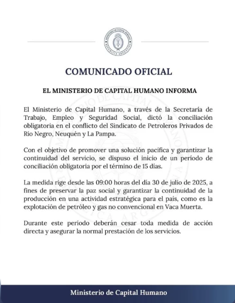 La Secretaría de Trabajo, Empleo y Seguridad Social, dependiente del Ministerio de Capital Humano, dispuso este martes la conciliación obligatoria para frenar el paro convocado por el Sindicato de Petróleo y Gas Privado de Río Negro, Neuquén y La Pampa. La medida, que entrará en vigencia desde las 9 de la mañana del miércoles 30 de julio, busca “promover una solución pacífica al conflicto y garantizar la continuidad del servicio”, según informó la cartera que encabeza Sandra Pettovello.