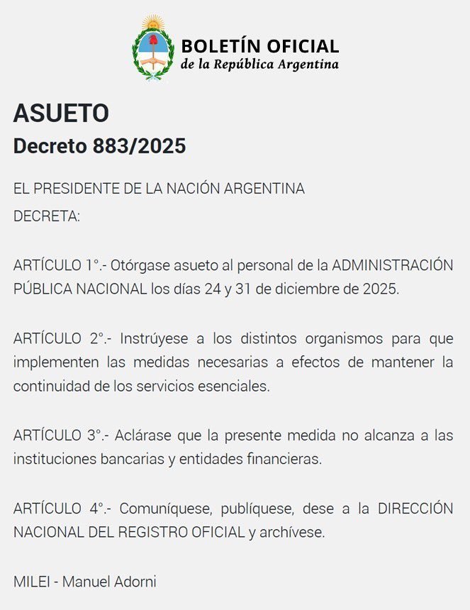 El Gobierno nacional oficializó un asueto administrativo para los días 24 y 31 de diciembre de 2025 destinado al personal de la Administración Pública Nacional, según lo establecido en el Decreto 883/2025 publicado este lunes en el Boletín Oficial.