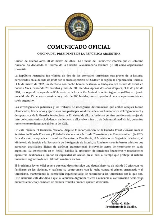 La medida fue comunicada por la Oficina del Presidente y se basa en investigaciones judiciales y reportes de inteligencia que vinculan al CGRI con los atentados perpetrados en Argentina en la década de 1990.