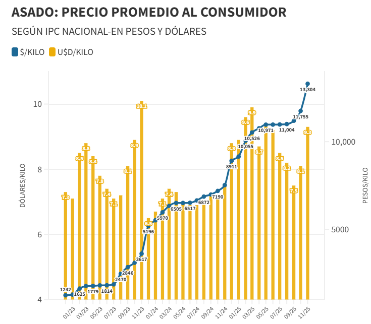 Otro dato que llamó la atención fue el valor del asado medido en dólares. Con el tipo de cambio oficial prácticamente estable, el kilo del corte se ubicó en torno a los 9,3 dólares, un nivel que marca una recuperación significativa respecto de meses anteriores. La estabilidad cambiaria dejó al descubierto que el ajuste fue real y no explicado por movimientos del dólar, sino por desequilibrios propios del mercado cárnico.