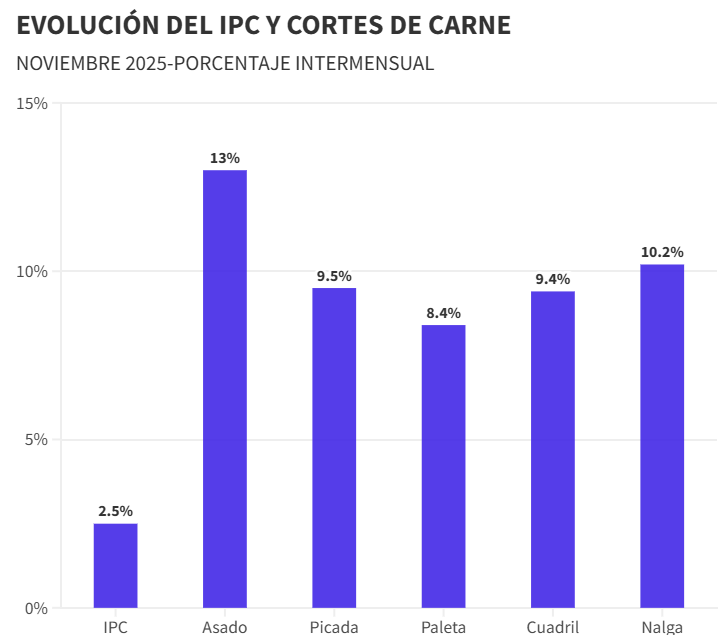 El aumento no fue exclusivo del asado. Otros cortes como la nalga, el cuadril, la paleta y la carne picada también registraron subas de dos dígitos en noviembre, confirmando que el encarecimiento alcanzó a toda la canasta de carnes. Especialistas señalan que este comportamiento suele darse en etapas de recomposición de precios, cuando la oferta se ajusta y el mercado redefine el equilibrio entre exportación y consumo interno.