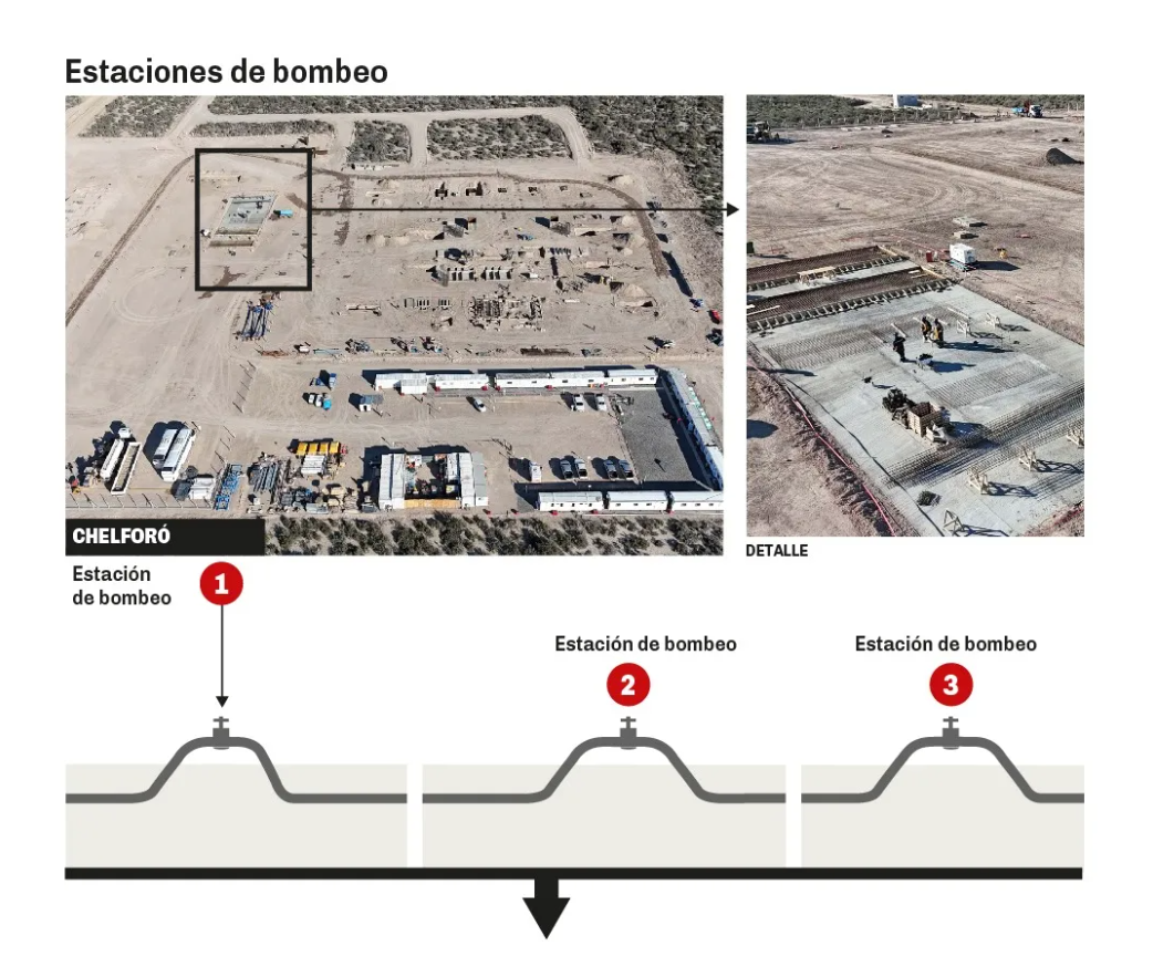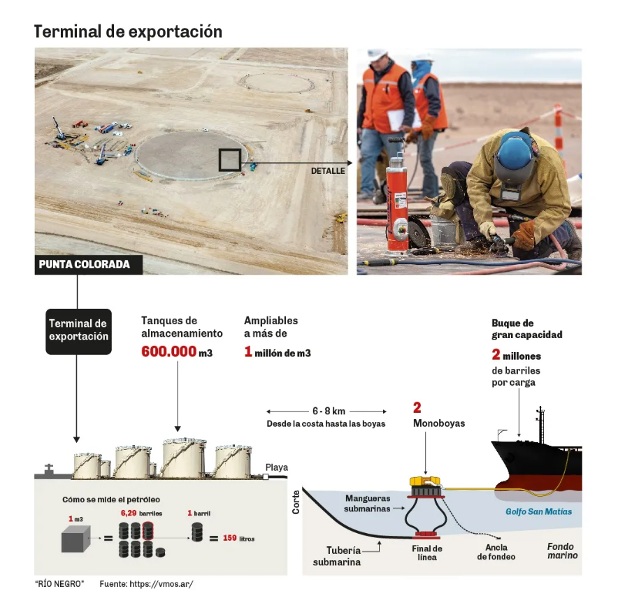 La obra avanza en cuatro frentes principales: la soldadura de ductos entre el sur del río y Sierra Grande, la construcción de la cabecera de bombeo en Allen, la estación intermedia en Chelforó y la terminal portuaria de Punta Colorada. Se espera que el oleoducto esté operativo a finales de 2026. Además, YPF evaluará en las próximas semanas la construcción de un segundo ducto paralelo para aumentar la capacidad de exportación desde Vaca Muerta.